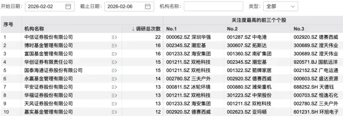 本周调研总次数排名前十机构
