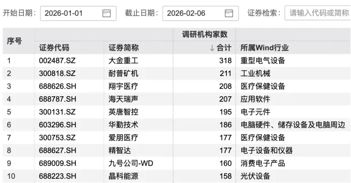 数据显示,今年以来,有超700家上市公司披露机构投资者调研记录。其中大金重工获机构调研家数最多,达318家。