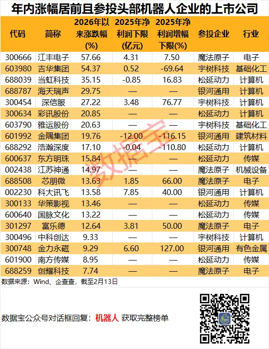 另外,海天瑞声、深信服、彩讯股份2026年以来累计涨幅均超过25%,3家公司分别投资了银河通用、宇树科技、松延动力。