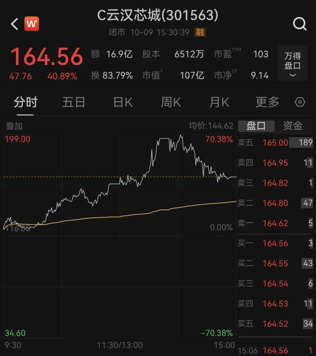 此外,次新股云汉芯城(301563)收盘上涨40.89%报164.56元/股,盘中最高涨超70%至199元/股,触发两次临停。该股9月30日登陆创业板,发行价为27元/股,首日收盘上涨332.6%报116.8元/股。