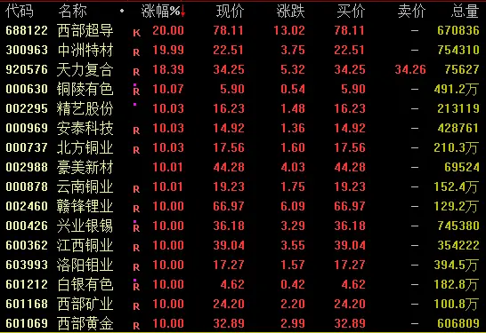 有色板块盘中集体走高,钴、镍、锂矿、黄金概念等表现亮眼,截至收盘,天力复合涨超18%,铜陵有色、北方铜业、云南铜业、西部黄金、四川黄金、赣锋锂业等均涨停。