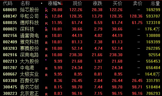 存储芯片概念再度走强,截至收盘,灿芯股份20%涨停,华虹公司涨超12%,盘中一度涨停,创出新高;德邦科技涨近12%,通富微电、雅克科技、深南电路等均涨停。