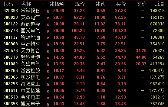 可控核聚变概念盘中强势拉升,截至收盘,常辅股份30%涨停,英杰电气、西部超导、国光电气、哈焊华通等均涨停。
