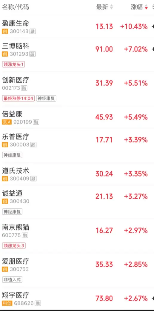 脑机接口概念股异动,创新医疗一度触及涨停,盈康生命、倍益康、南京熊猫、爱朋医疗跟涨。