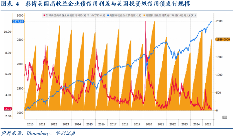 尽管美国面临政府停摆和贸易关税等宏观不确定性,但信贷市场的风险偏好却异常高涨,企业借贷成本降至历史低位。宏观不确定性导致美元和美债收益率承压,同时推动黄金期货价格升至历史新高。但与宏观担忧形成鲜明对比的是,信贷市场和企业活动正释放出强烈的乐观信号。截至2025年9月底,彭博美国高收益企业债信用利差为2.67%,收窄至历史低位,意味着投资者愿意接受更低的风险溢价来持有公司债券,表明市场对企业信贷质量和偿债能力的高度信心。与此同时,在借贷成本降至历史低位和投资者需求旺盛的推动下,美国公司债市场迎来了发行热潮。截至2025年9月底,2025年美国投资级企业债发行规模为1.97万亿美元,处于2010年以来的高位。