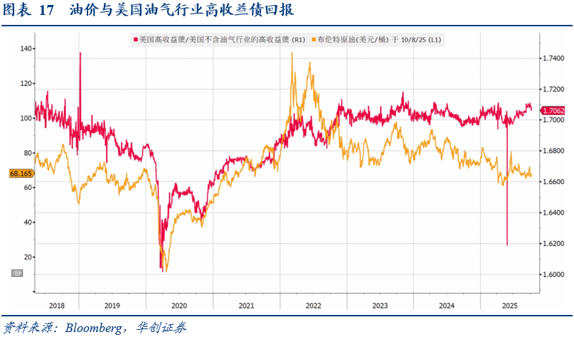 美国油气开发企业的垃圾债相对于垃圾债整体市场的回报表现与油价走势高度一致。油价上涨不利于实体经济中的大多数行业,但有助于改善油气开发企业的财务状况,降低该行业公司债的信用利差水平。