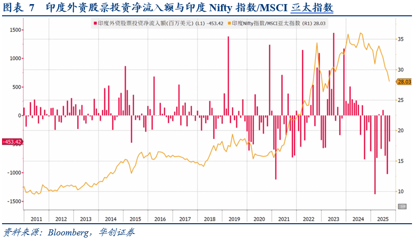 尽管有本土资金的强劲支撑,印度股市在2025年的表现却连续第五个月落后于更广泛的MSCI亚太市场指数,创下自2013年以来的最长跑输周期,显示出外资与内资对印度股市前景的分歧。当前印度股市形成了“外资流出,内资接盘”的格局,这种分歧是印度股市跑输亚太市场的主要原因。海外投资者对印度股市的抛售,主要反映了他们对宏观不确定性的担忧,特别是美国关税政策对全球供应链和印度出口型企业的潜在影响,以及对印度企业盈利增长前景的谨慎态度。