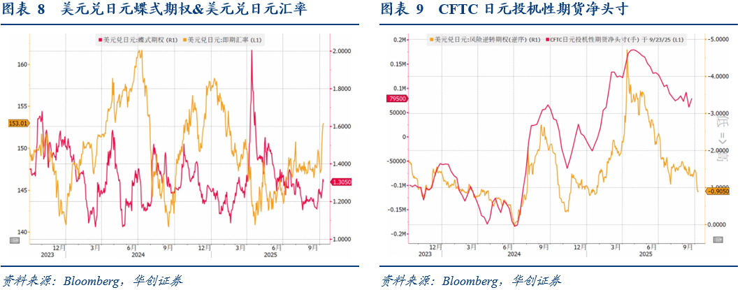 截至2025年9月底,对冲基金和资产管理公司对日元的净多头头寸回落至79500份,反映了市场对日元看涨情绪已经告一段落。此外,美元兑日元蝶式期权组合成本相比4月份的高点大幅回落,反映了投资者认为日元汇率的波动性将减弱。随着10月4日日本前经济安全保障担当大臣高市早苗成为自民党首位女总裁,市场普遍押注日本将采取宽松的货币政策以及日元进一步走弱。