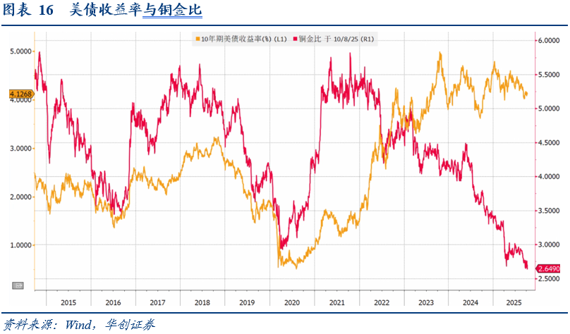 铜金比通常被认为是美债收益率的领先指标,其背后的原理是:铜具有工业属性,被广泛应用于电子电气、家电、机械、建筑等领域,铜的需求通常反映了实体经济的活跃程度;而黄金具有价值储藏功能和避险价值。铜金比可以作为市场对风险资产的偏好和对美国国债安全的感知程度的指标。