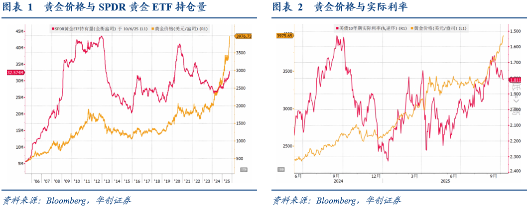 国际现货黄金价格近期延续强劲上涨势头,9月底伦敦金现价格突破3800美元/盎司,再次刷新历史纪录,继续向上冲击4000美元/盎司的整数关键点位。本轮黄金价格的迅猛上涨是由多重系统性因素和市场情绪共同推动的结果:一是美联储降息预期与实际收益率下降,实际利率的下降使得黄金相对于有息资产更具吸引力,吸引近期黄金ETF持仓量持续提升;二是地缘政治不确定性与避险需求,包括美国政府“停摆”、高市早苗或将成为日本首位女首相、法国总理勒科尔尼辞职等;三是各国央行持续购金。过去两次百年秩序重构期,1800年前后、1930年前后,都出现了10年左右的黄金激烈脉冲(3-5倍),当下秩序重构加剧的背景下,建议关注黄金的历史性机会。