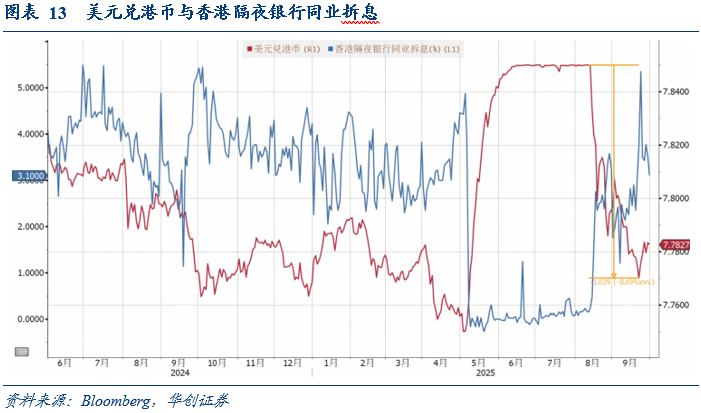 9月下旬香港隔夜银行同业拆息飙升至5.35%,创下近一年来的最高水平,凸显了港元短期资金市场的紧张。背后的原因是,香港金融管理局为捍卫港元兑美元 7.75-7.85 的联系汇率制度,在港元触及弱方兑换保证时,持续买入港元。这一操作直接从银行体系中抽走了流动性,导致银行体系的总结余大幅萎缩。在流动性收紧、内地资金持续流入港股市场以及套利交易平仓的背景下,港币在8月12日~9月22日期间快速升值1.02%,创下自2003年以来最快升值速度,并升至7.7702的水平。