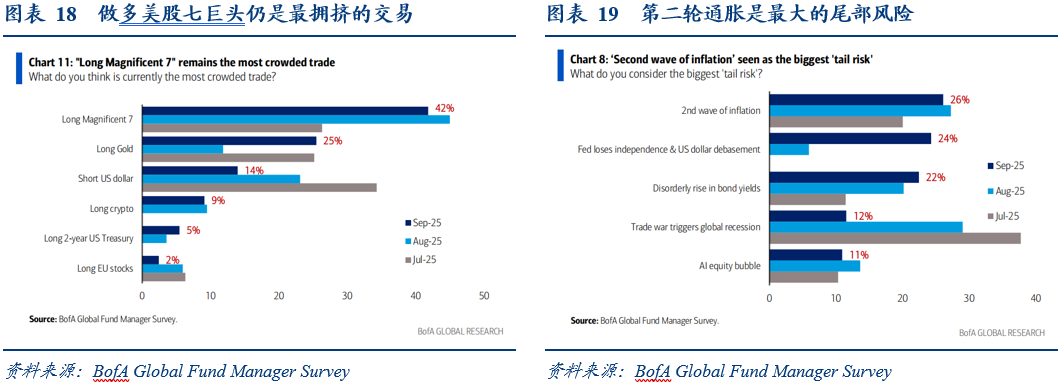 根据美银全球基金经理调查报告,第二轮通胀是最大的尾部风险。2025年8月,29%的基金经理认为全球贸易冲突触发全球衰退是最大的尾部风险,其次是通胀阻止联储降息(27%),第3位是债券收益率的无序上行(20%)。到了2025年9月,26%的基金经理认为第二轮通胀是最大的尾部风险,其次是美联储失去独立性&美元贬值(24%),第3位是债券收益率的无序上行(22%)。