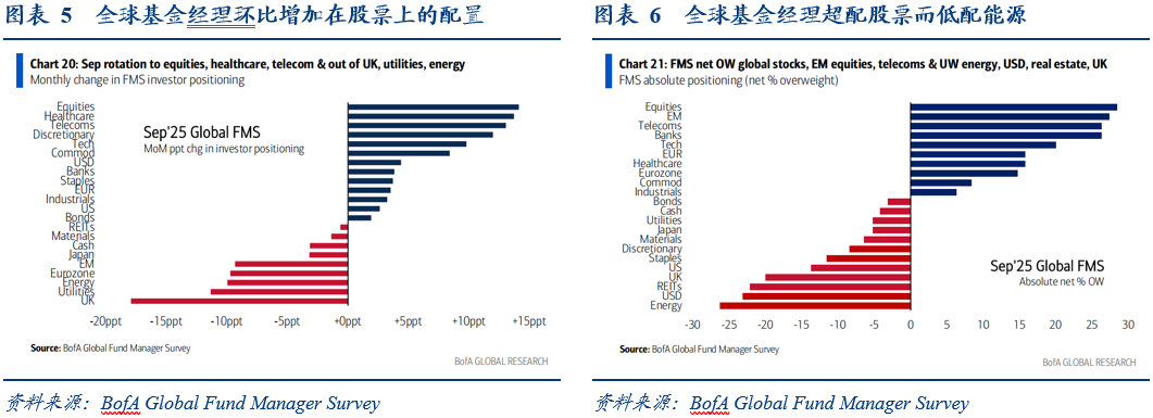 根据2025年9月的美国银行全球基金经理调查,全球基金经理环比增加了在股票、医药、通信、可选以及科技上的仓位,同时降低了在英国、公用事业、能源、欧元区和新兴市场上的仓位。与此同时,全球基金经理在股票、新兴市场、通信、银行和科技上超配最多,在能源、美元、REITS、英国和必选上低配最多。