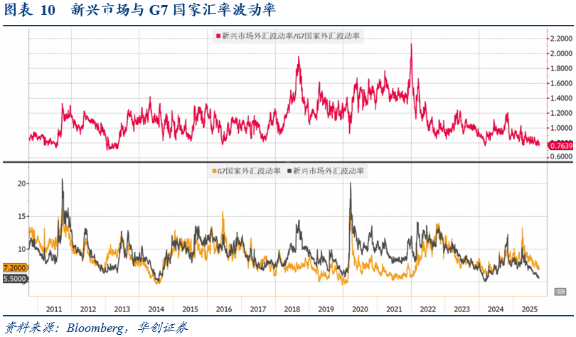 通常情况下,新兴市场货币因其宏观经济和政治的不确定性更高,其波动率应显著高于G7货币。但2022年以来全球外汇市场正经历一次罕见的结构性变化,即新兴市场货币的汇率波动率与G7国家货币的波动率之比持续回落,截至2025年9月底已降至0.76,达到 2013年以来的最低水平。波动性降低显著改善了套息交易的风险回报状况,使得投资者能够更自信地在高息货币上获取高额收益,而不必过度担心利润被汇率波动所侵蚀。